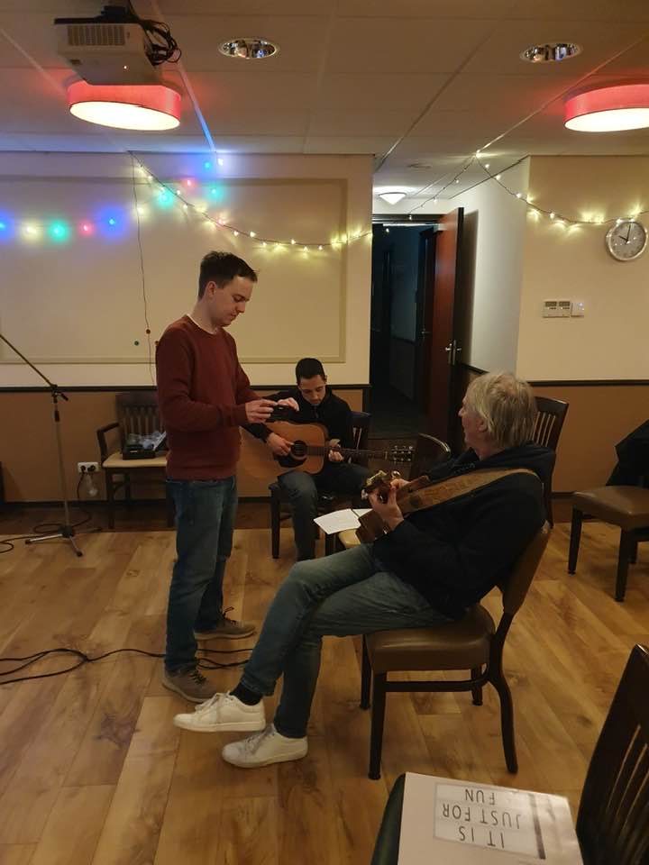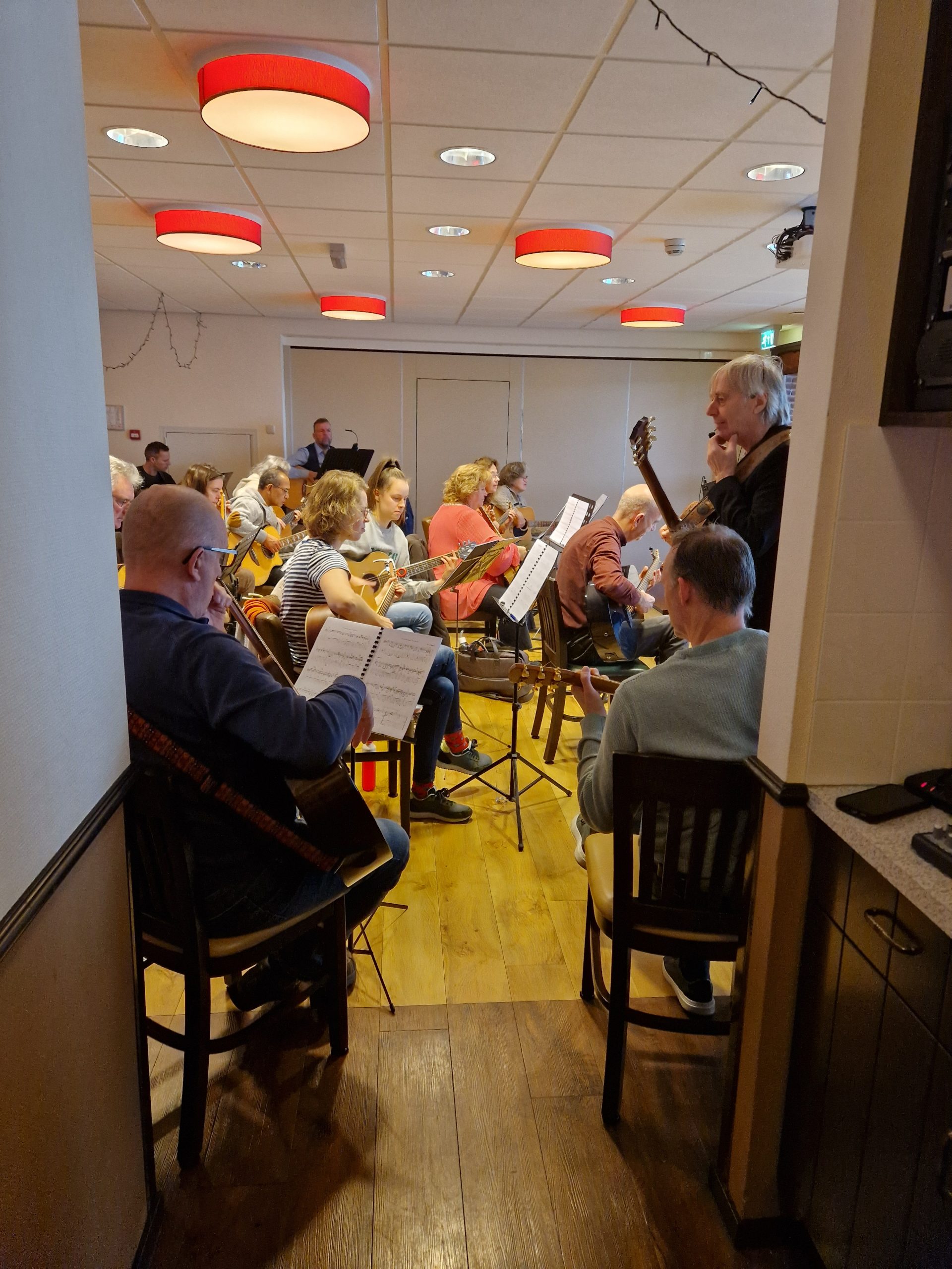 Er werd deze twee dagen aan vier (technisch pittige) nummers gewerkt en wat me het meest verbaasde, was dat door de inzet en gedrevenheid van alle deelnemende gitaristen zelfs mijn fingerstyle arrangement van het Beatles-nummer Eleanor Rigby in zijn geheel uit alle vingers werd getoverd! Het enthousiasme tijdens de ‘bonte avond’ die op zaterdagavond tot diep in de nacht plaatsvond- en waar iedereen kon optreden, gitaarspelend en/of zingend, en solo of met elkaar – maakte deze twee dagen helemaal af. Met dank aan alle deelnemers!